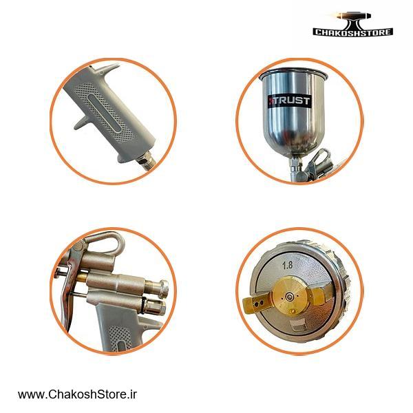 پیستوله بادی ساخت برند TRUST با کیفیت درجه یک و قابلاعتماد پیستوله رنگ پاش کاسه رو فلزی دو تنظیم با طراحی حرفهای مناسب برای رنگ های روغنی با ماشه حساس به فشار فشار کاری 3.5 بار (50 PSI) برای پاشش یکنواخت و پایدار کاسه فلزی با ظرفیت 600 میلیلیتر برای کاربری طولانیمدت نوع تغذیه Suction برای افزایش کارایی و بهرهوری در کار حجم هوای مصرفی بین 3 تا 8 CFM قابل تنظیم برای نیازهای مختلف سایز نازل 1.8 میلیمتری استیل برای پوشش صاف و یکدست وزن سبک 500 گرمی مناسب برای استفاده طولانیمدت ساخت کشور چین با ضمانت اصالت، کیفیت و سلامت فیزیکی کالا
