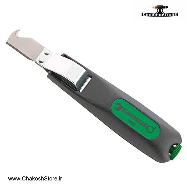 ابزار دستی قدرتمند و پر کاربرد برند اشتایویل ساخت آلمان چاقو کابل بر تنظیم شو سریع، دقیق و کاملا خوش دست مجهز به قلاب تیغ برای نگهداری و مهار کابل به شکل کامل روکش برداری 2 حالته خطی و گرد بدون آسیب به مغزی امکان تنظیم عمق برش با پیچ انتهایی از 4 تا 28 میلی متر تیغه از جنس استیل سخت کاری شده و حرارت دیده دسته از جنس لایه رابری انحصاری ضد لغزش پوست دست وزن سبک 82 گرم و تولید طبق استانداردهای روز اروپا تضمین کیفیت و اصالت کالا و ارسال سریع به کل کشور