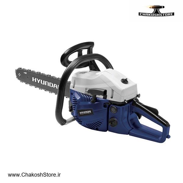 اره زنجیری بنزینی برند Hyundai کره و ساخت کشور چین دارای موتور احتراقی دو زمانه 2200 وات (3 اسب بخار) مجهز به استارت سریع و سیستم ضد لرزش حجم موتور 50.1 سی سی با ساطور 45 سانتی متر استارت از جنس منیزیوم با وزن کم و مقاومت بالا در برابر ضربه حجم مخزن سوخت 550 میلی لیتر و مخزن روغن 260 میلی لیتر دارای سیستم روغن کاری اتوماتیک زنجیر و ترمز دستگاه سرعت در حالت بی باری 3000 دور در دقیقه به همراه آچار، کاور ساطور و بطری ترکیب روغن/بنزین ضمانت اصالت و سلامت کالا و 12 ماه گارانتی رسمی