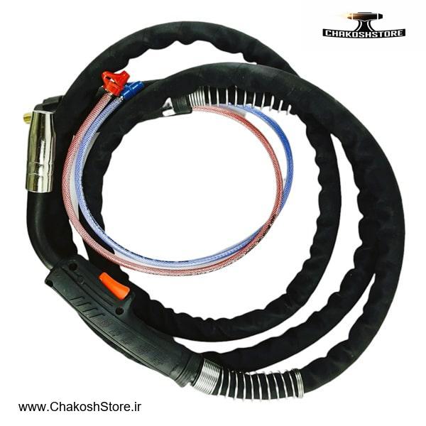 مشعل و تورچ جوشکاری C02 آب خنک کمپانی توان جم ایران مخصوص نصب و جوش با اینورتر سنگین و صنعتی میگ / مگ با استاندارد ملی INSO 11225-7 و استاندارد جهانی IEC 60974-7 چرخه کاری 100 درصد و مجهز به ماشه بزرگ حساس به فشار حداکثر جریان با گاز میکس 350A و گاز دی اکسید کربن تا 400A دارای مجموعه شعله پوش نسوز و عایق حرارتی فایبرگلاس دسته ضد ضربه از جنس پلی آمید الیاف دار درجه یک و مرغوب کابل با روکش نسوز و قابل سفارش در طول های 3 - 4 - 5 متری لوله و گردنه چند لایه روکش شده از جنس ضد گرما و حرارت امکان تزریق سیم ها با قطر مختلف از 1 تا 2.4 میلی متر
